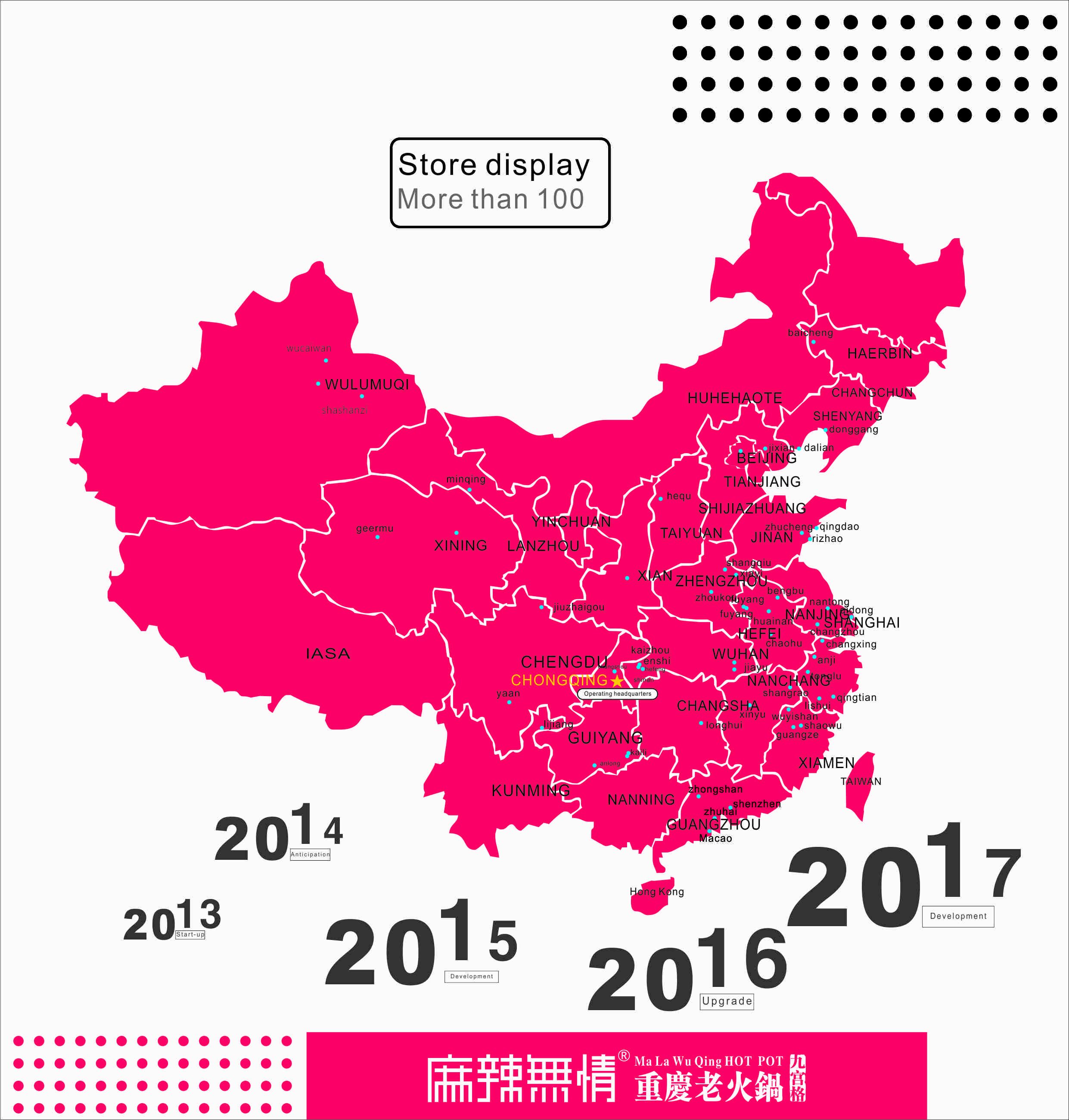 2013年公司凝聚多年品牌运营管理经验,并不断引进了餐饮营建、运营、技术、策划等方面的专业人才,携手共进共同奋斗!同时也得到了相关行业协会的大力支持和帮助。2016年麻辣无情·重庆老火锅遍布全国90余个大小城市,截止2017年3月,全国店面超过100家。